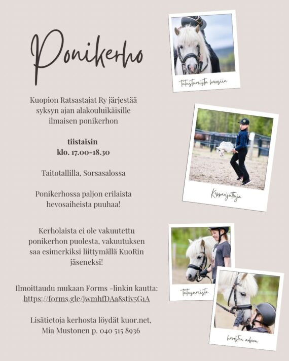 KuoRin ponikerho palaa! Kauan odotettu ja toivottu ponikerho tekee paluun Kuopion Ratsastajat Ry järjestää syksyn ajan alakouluikäisille suunnatun ponikerhon Taitotalleilla (Puikkarintie 49) tiistaisin klo. 17-18.30 (pl. Loma-ajat sekä arkipyhät). Syksyn ensimmäinen kerhokerta järjestetään 30.9. Kerho on osallistujille ilmainen. Kerhossa puuhaillaan monipuolisesti hevosaiheiden äärellä ja luvassa on paljon erilaista tekemistä, kuten […]